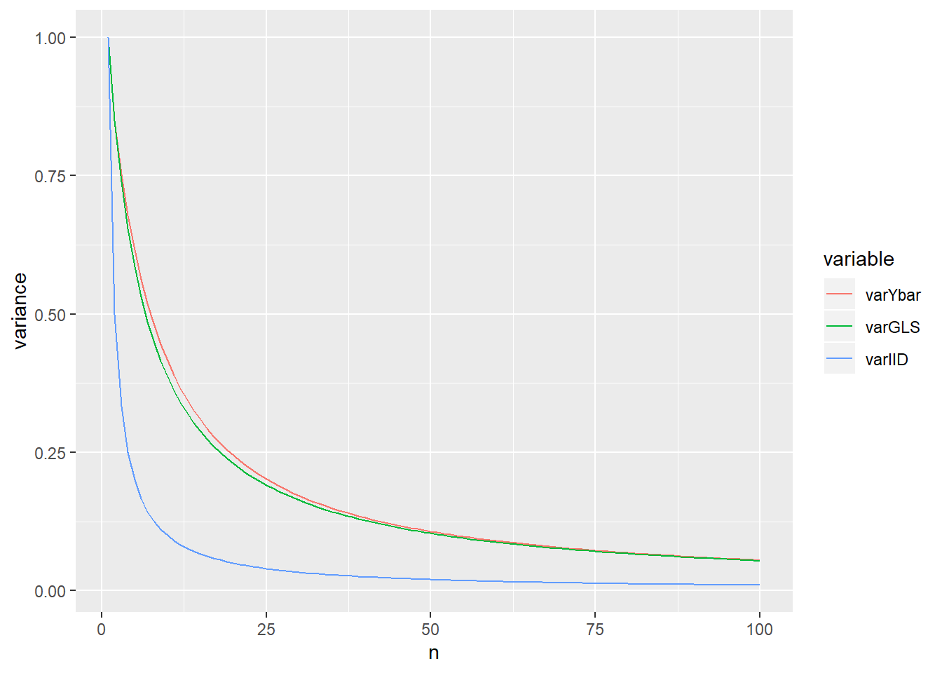 Given \(\rho = 0.7\), the following shows how the efficiency of \(\bar Y\) and \(\hat \mu_{GLS}\) changes with \(n\) increasing.