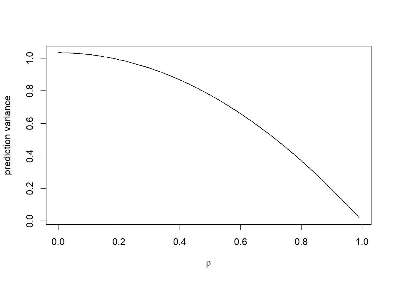 In order to find the best linear unbiased prediction, we should minimize \[{\mathbb{E}}({\mathbf{a}}^\top {\mathbf{Y}}- Y_0)^2\ \ \text{subject to}\ \ a^\top \mathbf{1} = 1.\] The solution is \[\hat Y_0 = \hat \mu_{GLS} + {\mathbf{c}}^\top \Sigma^{-1}({\mathbf{Y}}-\mathbf{1}\hat \mu_{GLS}).\] Further, we can obtain the variance of \(\hat Y_0\), \[\sigma_{pred}^2 = {\mathbb{E}}(\hat Y_0-Y_0)^2 = \sigma^2 - {\mathbf{c}}^\top \Sigma^{-1}{\mathbf{c}}+ (1-\mathbf{1}^\top \Sigma^{-1}{\mathbf{c}})^2(\mathbf{1}^\top \Sigma^{-1}\mathbf{1})^{-1}=\sigma^2(1+1/n)C(n,\rho),\] where \[C(n,\rho) = (1-\rho^2)\left\{1-\frac{2\rho}{(n+1)(n-n\rho+2\rho)}\right\}\leq 1-\rho^2\leq 1, \ \text{for}\ \rho \in [0,1].\]
