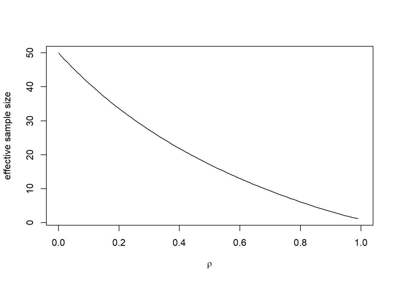 Further, if we consider the 95% confidence interval for \(\mu\). The Z interval is given by \[ \bar Y \pm 1.96 sd(\bar Y) = \bar Y \pm 1.96 \frac{\sigma\sqrt{C(\rho,n)}}{\sqrt{n}} .\] So it is wider than the case when \(Y_i\)s are independent. With the same accuracy, the equivalent number of observations needed in the independent case, so called effect sample size is given by \(n' = n/C(\rho,n).\)