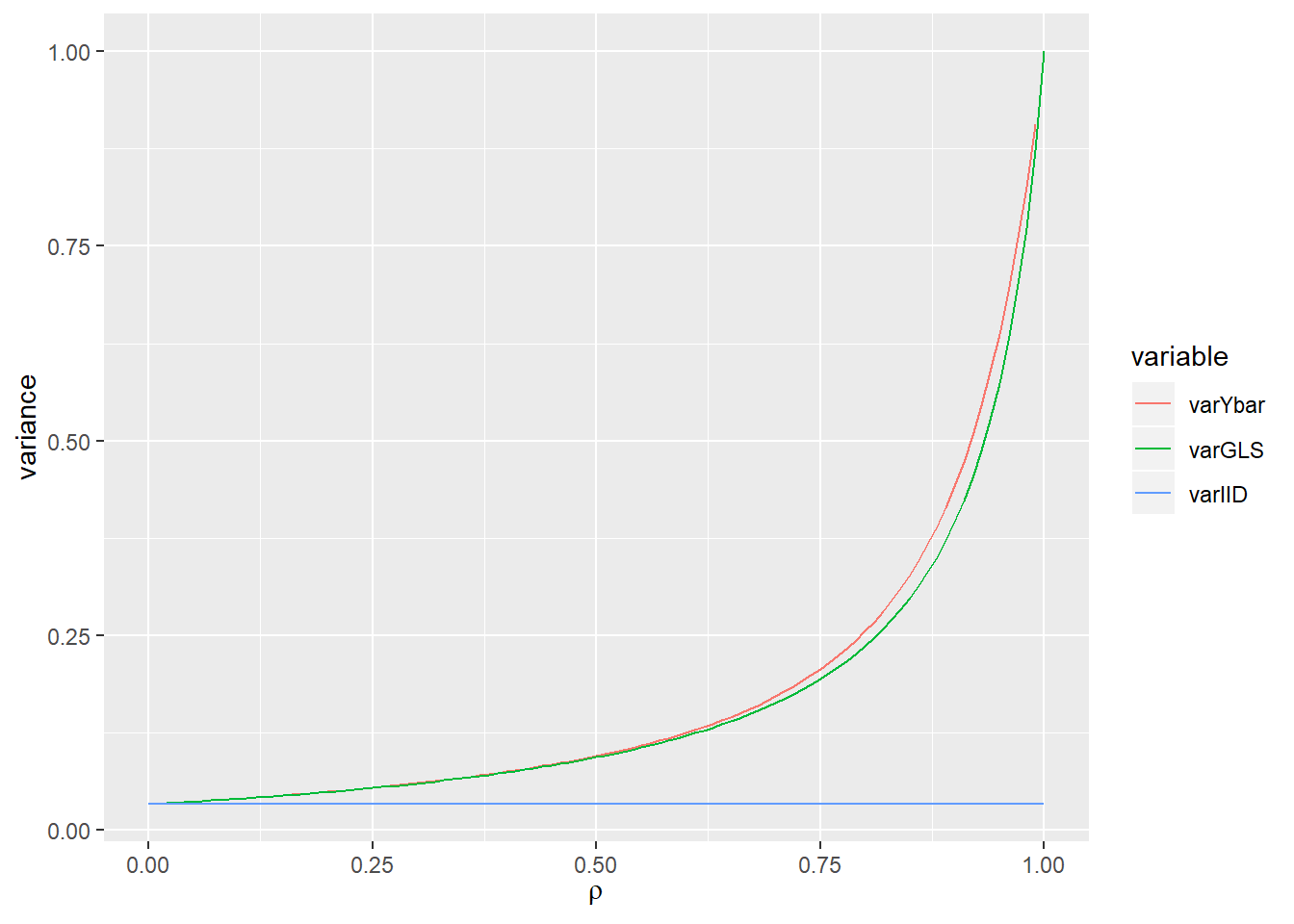 Since for \(\rho \in (0,1)\), \(C(\rho, n) > 1\) and hence \(\text{Var}(\bar{Y}) > n^{-1} \sigma^2\). As we know, if \(Y_1, ..., Y_n\) are independent with each other, the variance of \(\bar Y\) is \(n^{-1} \sigma^2\). So we can see that sample mean for correlated data seems not as efficient as that for independent data.